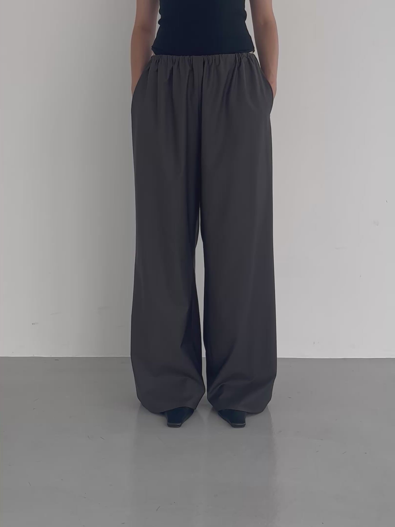 ” Made with ease in mind, the waist features a slim elastic band and adjustable drawstring for a comfortable fit. Despite their relaxed construction—unlined and breathable—they fall in a sleek, straight silhouette reminiscent of tailored slacks.